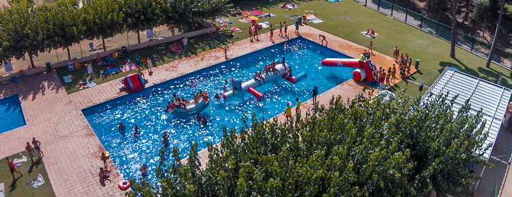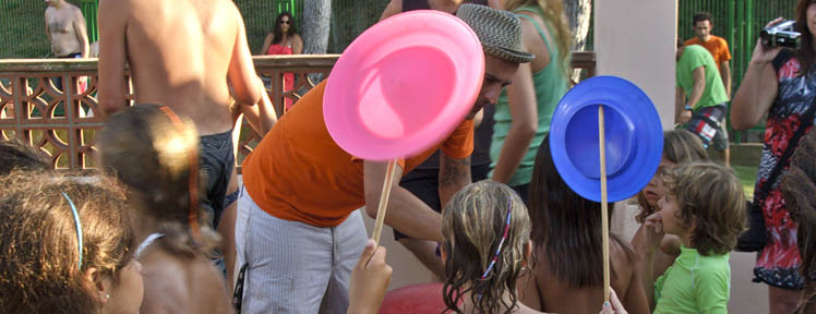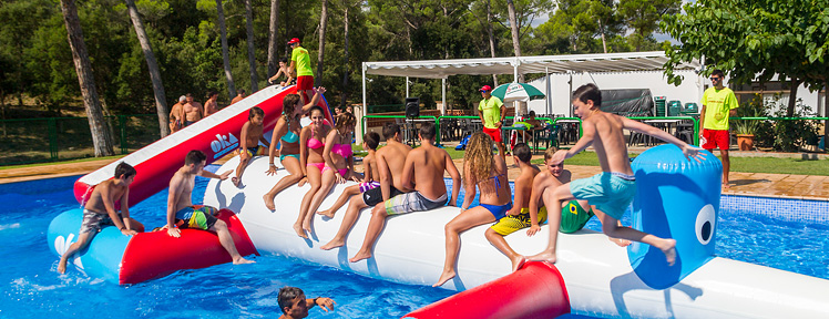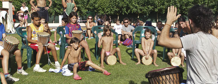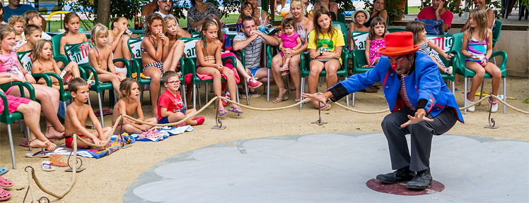 L'été, nous organisons, dans le camping, des activités pour tous les âges : jeux dans la piscine avec des gonflables géants, bals, spectacles de flamenco, ateliers cirque, bulles de savon, maquillage, percussion, etc.
